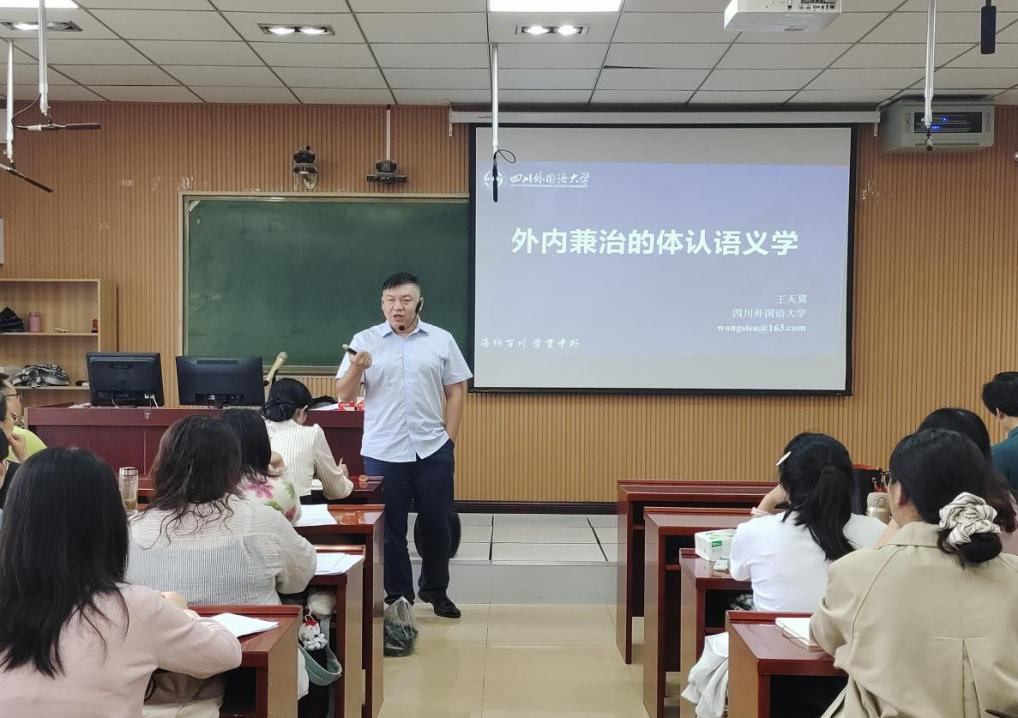 四川外国语大学中外文化比较研究中心主任、博士生导师、中西语言哲学专委会会长李洪儒教授以“体认哲学”为主题,重点解读了体认语言学的哲学基础及其语言观,系统介绍了“体”与“认”的辩证统一关系,并建议老师们在申报国社科项目时要科学合理规划时间,主动强化研究意识,积极构建高效的项目申报机制。